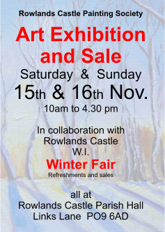 ROWLANDS CASTLE PAINTING SOCIETY AND ROWLANDS CASTLE WI are joining together again to put on the ever popular Art Exhibition and Winter Fair on NOVEMBER 15TH AND 16TH from10am to 4.30pm at Rowlands Castle Parish Hall, Links Lane, PO9 6AD.